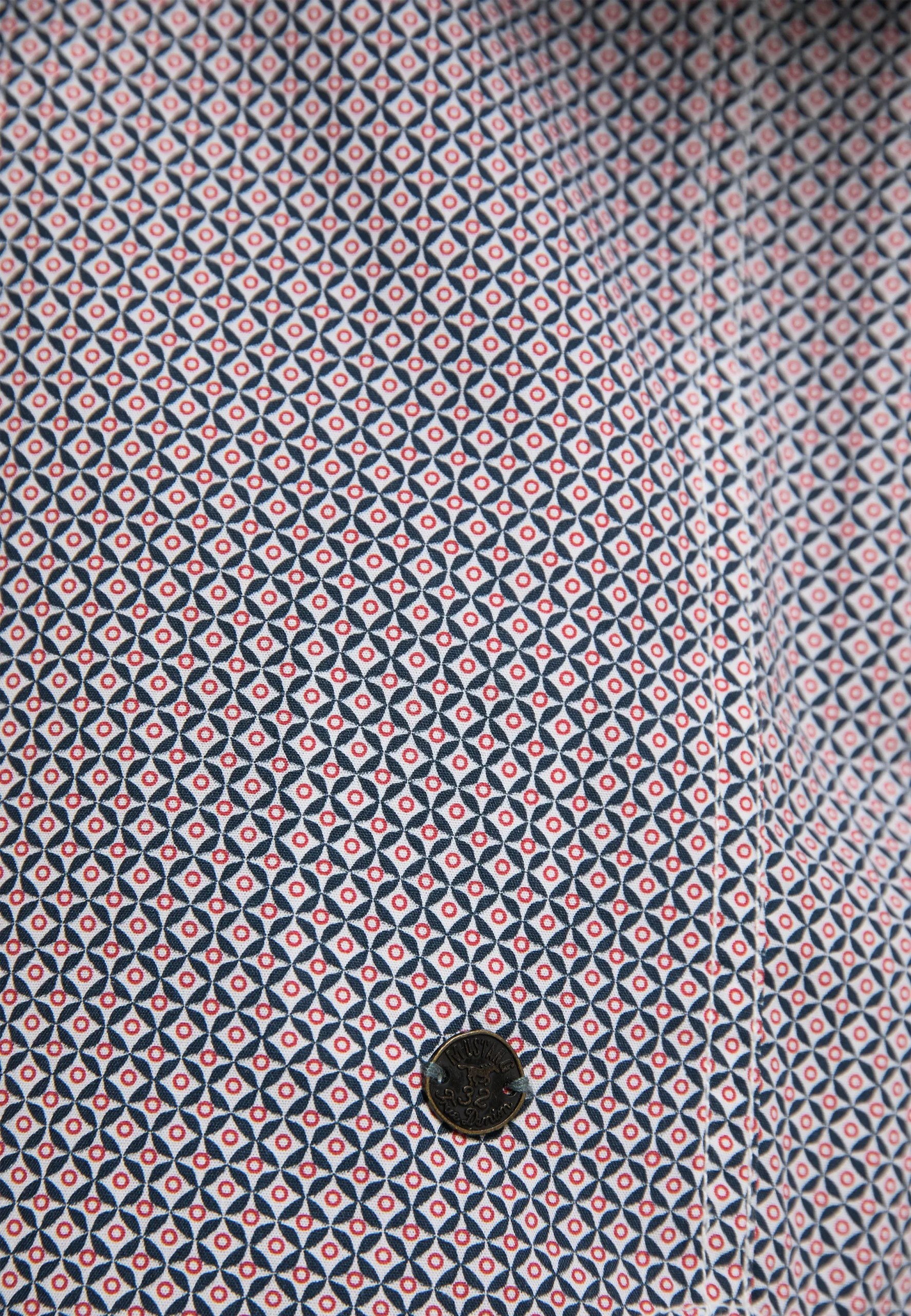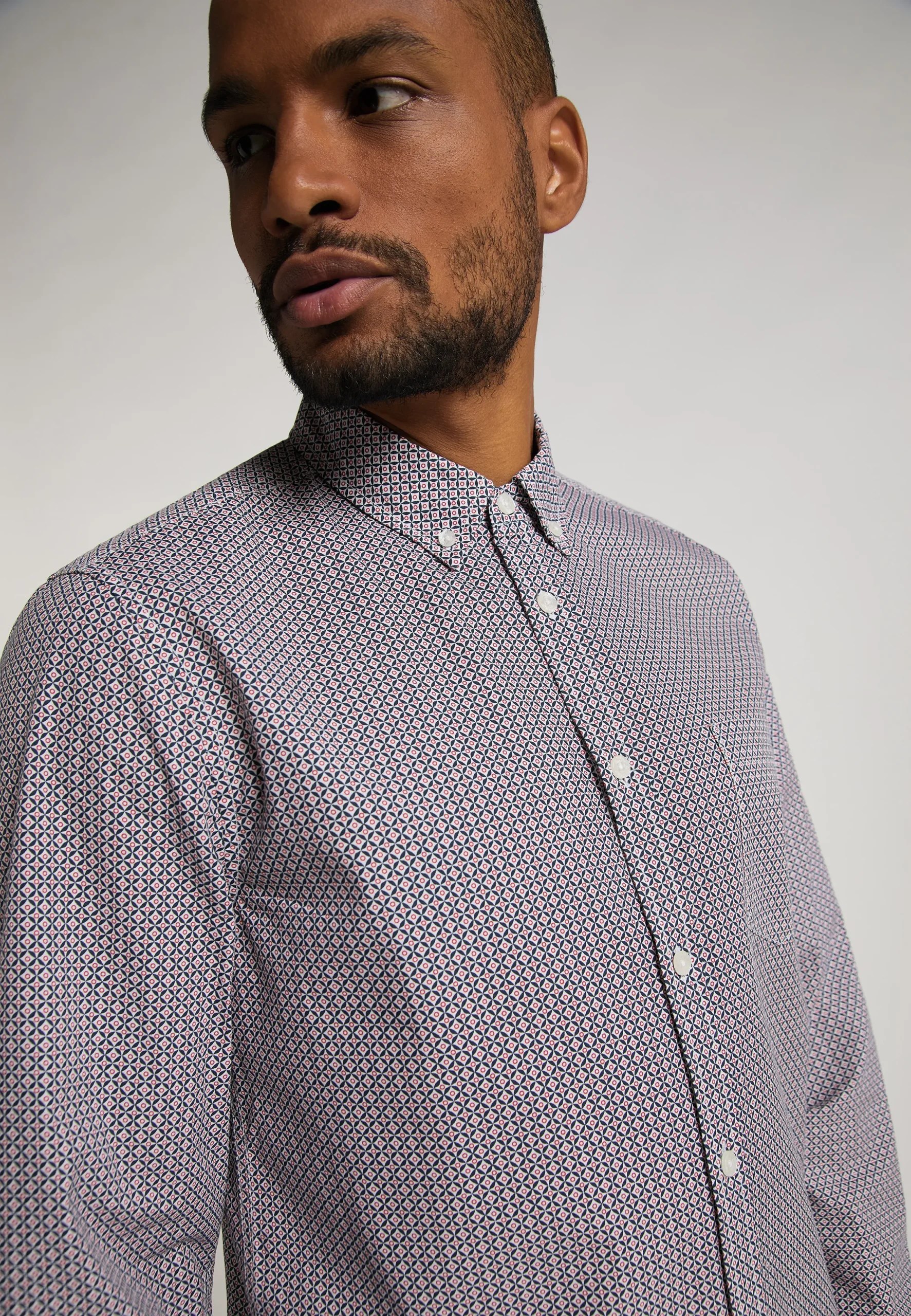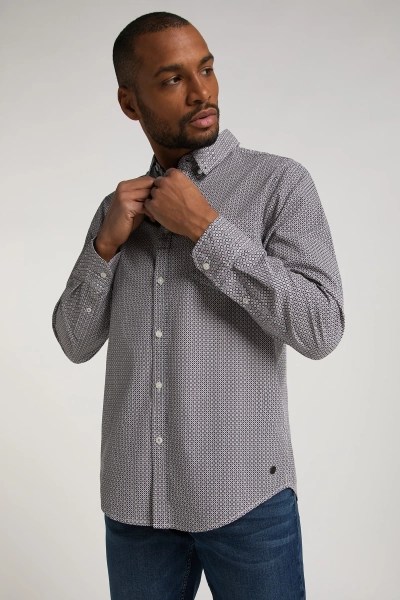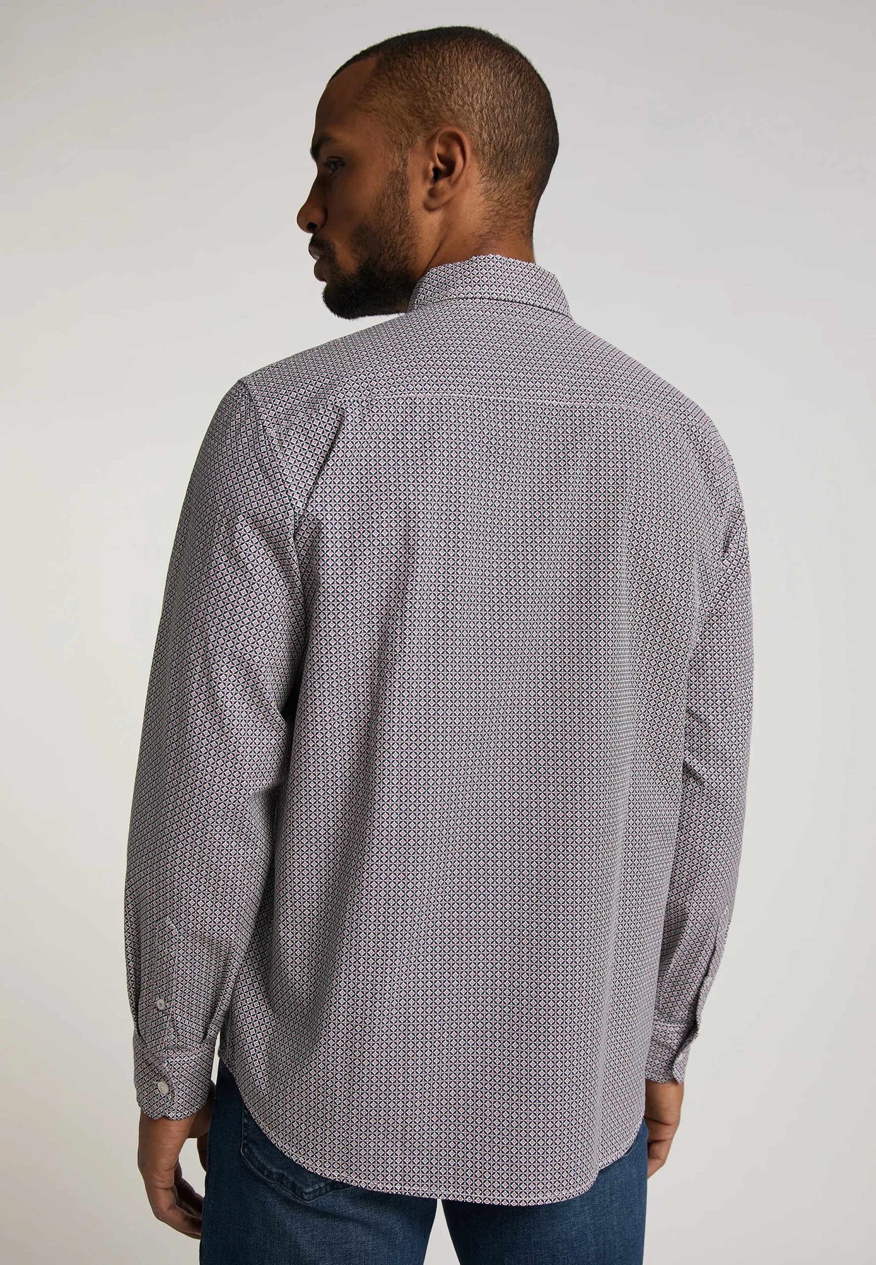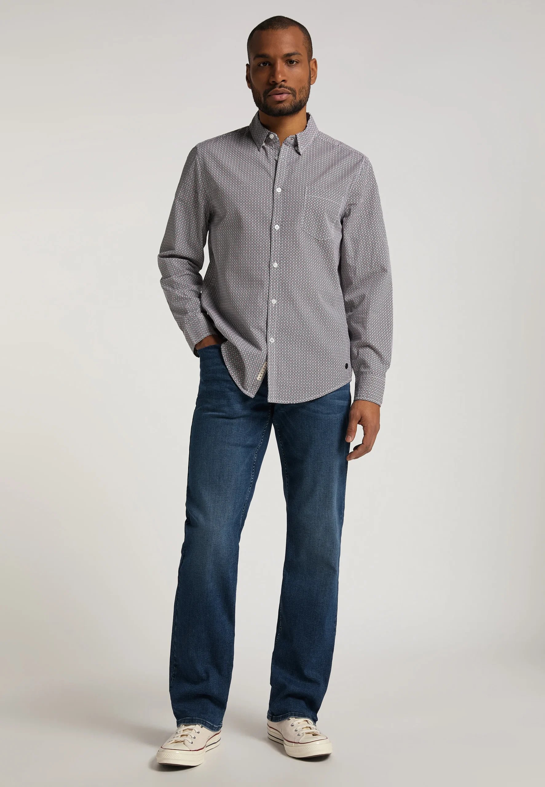 Мужская рубашка с оригинальным этническим рисунком, отложным воротником, длинными рукавами и одним накладным карманом. Классический прямой крой. Ткань хлопковая, двойного переплетения. Рубашку отлично дополнит мужской образ с джинсами или слаксами.